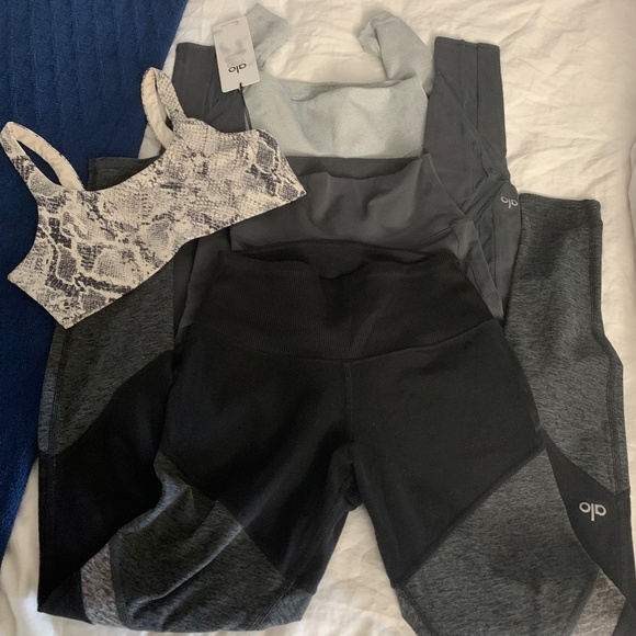 3 leggings xs great condition , dark grey with sheer siding, light gray pair, and a black grey . NWT snake skin print SMALL sports bra