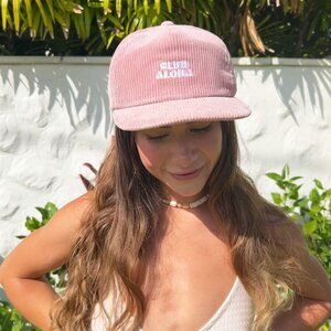 Add a pop of vintage-inspired color to your sunny-day outfits with this ultra-cute Club Aloha hat! Made from soft rose-colored corduroy, this trucker-style cap features white embroidery, a slightly structured crown, and an adjustable strap for the perfect fit. Whether you're heading to the beach, running errands, or styling it with a bikini, it’s a laid-back staple with just the right amount of aloha attitude.