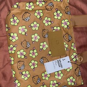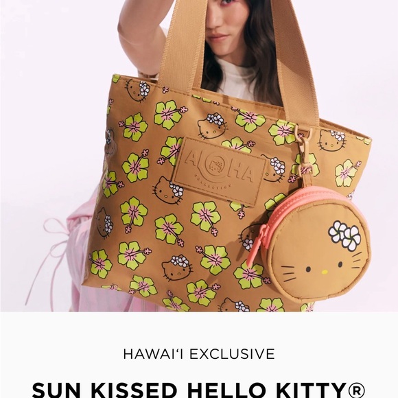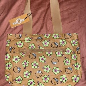 Limited Edition, Shipped to Hawaii only during release. Stylish tote with Hello Kitty design. Features tan background with pink and green floral accents. Perfect for casual outings.