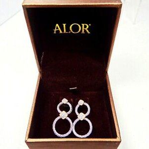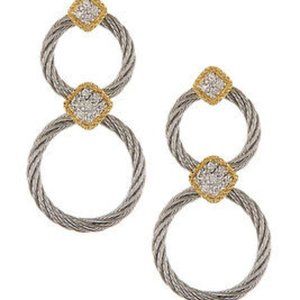 Stunning ALOR design, 18K white gold, stainless steel cable and 0.11ctw pave diamond double hoop earrings are 5/8'' to 0.5 wide and 1 2/8'' long, with butterfly fastening. There is no dark spots or discoloration, just picture imperfection.