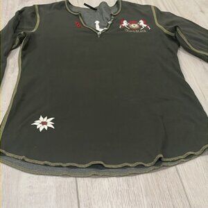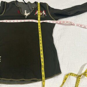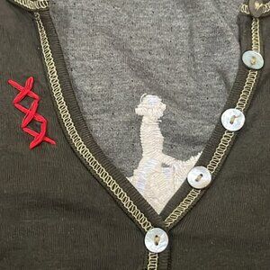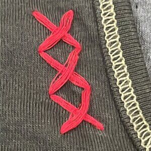 Has 3 red stitched X’s on tight side of V neck