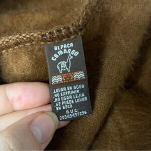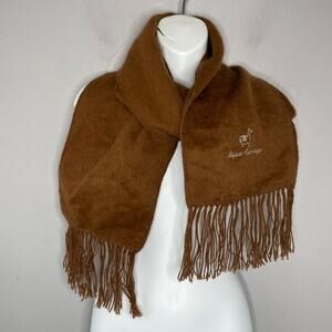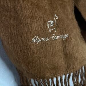 Brown alpaca blend scarf with tassels and white stitched embroidered alpaca logo.