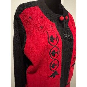ALPACA STYLE Artesian AT Vintage Black Red Embroidered Tassel Cardigan Sweater L