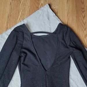 Pre-loved but in awesome condition stretchy, black with shimmery silver accent, top back cutout. Bodycon fit with long sleeves. Flat measurements: 16" pit to pit, 32" in length. Size S.