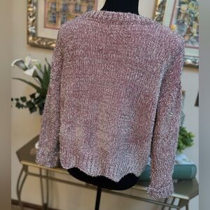Gorgeous pastel pink sweater perfect for any occasion. Soft fabric with a touch of sparkle for added elegance, scalloped hemline, crew neck, just a beautiful cropped sweater for your parties, back to school , social events. A very generous 23.5” ptp, 19” length.
