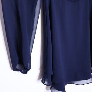 Lightweight, airy chiffon navy mini dress. Square neckline, smocked bodice, and unlined balloon long sleeves with elastic cuffs. The rest of the dress is lined.
