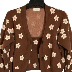 NWOT, Size: M, Color: Brown/Multi, Floral Print, Sweater Set, Cardigan: Long Sleeves, Button Front Closure, Cropped, Tank: Sleeveless, Spaghetti Straps, Cropped, Both: 52% Viscose/30% Polyester/18% Nylon, Machine Washable