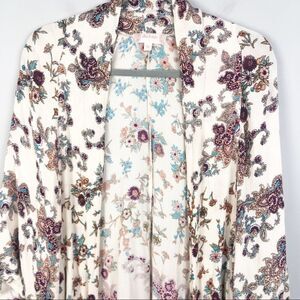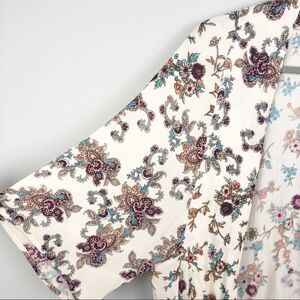 Gorgeous boho kimono by Altar’d State. Cream with earthy and jewel tones (burgundy, plum, blues, tans). Long waterfall front can be worn open or tied. Back is slightly shorter. Wide sleeves. Excellent condition. Size Large.