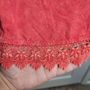 Altar'd State cold shoulder top in an acid wash red-orange color. Lace detail along the bottom hem.