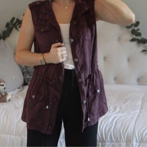NWT! This maroon vest is super stylish. Can be worn in every season. It has brass snaps and a zipper. It is a large and I am a size small. Runs big on me will fit medium to large well. It is in the shade "wine tasting".