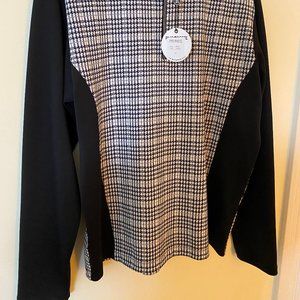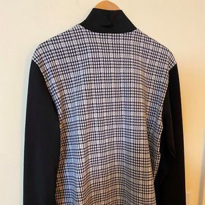 Natty, yet versatile "statement piece" in Glen Plaid torso + color block sleeves in performance-stretch portions