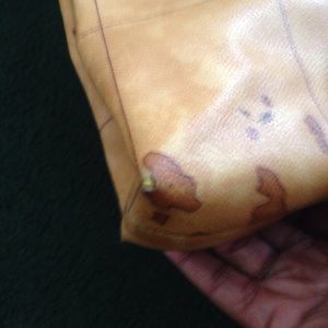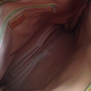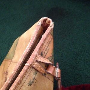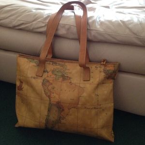 Geographically printed vinyl bag. Zip closure. 13.5' leather straps. Hang tag. Zip pocket inside clean interior. Wear on bottom corners & top trim. Beautiful roomy bag.