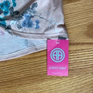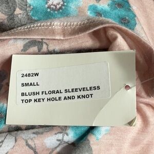 Always Anna Blush Floral Sleeveless Top. Size Small. NWT. Key hole at the neck and knot tie at the hem in the front. Adorable Summer top. Colors are Blush, turquoise, pink, gray & white.