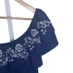 ALYA Blue One Shoulder Floral Embroidered Ruffle Top Peasant Boho Blouse Sz S