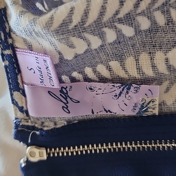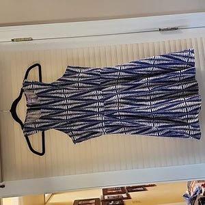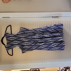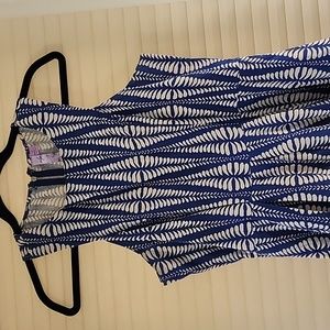 Always dress, size small. Blue and cream. Cut in shoulders, full skirt.