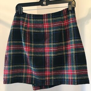 Polyester lined miniskirt, wool-blend outer layer. Festive for the season! Buttons and functions as a faux wrap skirt. Wears great with any tights with no catching! 15” waist; 18” in length. Zips up the right side. Originally from Francesca’s.
