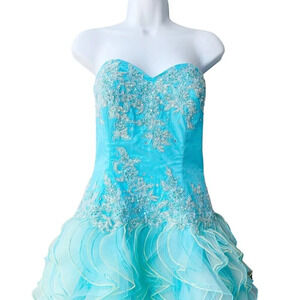 ALYCE DESIGNS Ruffle Sheer Prom Gown Size 8 Aqua Strapless Embellished Cocktail