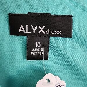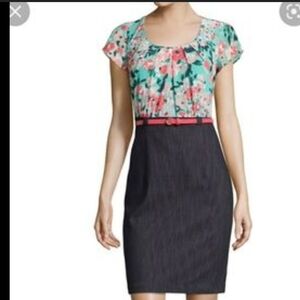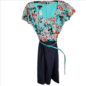 ALYX DRESS/ FLORAL PRINT BODICE WITH BLACK SKIRT AND BELT/ SIZE 10/ TEAL PEACH AND BLACK / MIDI/ VERY NICE