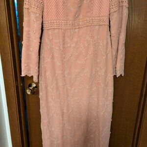 Fully lined, A-lined dress with floral lace detail. Long sleeve, full length