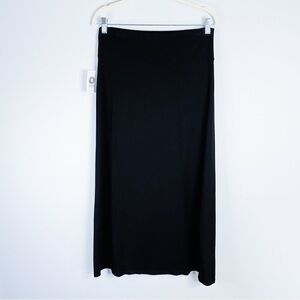 A-Line maxi skirt in black. Has stretchy waist. Fabric has stretch.