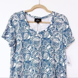 A-Line printed dress in white and blue. Short sleeves.
