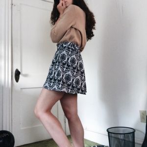 A-line skirt that hits at the mid-thigh. Waistband is stretchy, body is not. Worn only about 4 times; condition is like new.