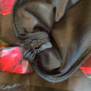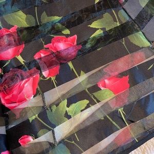 A-line black skirt with satin and sheer stripes and pink/red rose design. Hits below the knee, with black mini skirt underlay. zipper and hook & eye. Designer - Quiz. Bought in the UK - UK size 8 (US size 4) Euro size 36. Item is brand new, never worn!