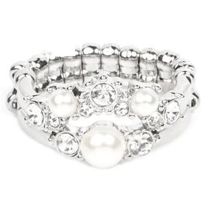 Featuring pronged silver fittings, a bubbly collection of white pearls and glassy white rhinestones coalesce into two effervescent bands across the finger. Features a dainty stretchy band for a flexible fit.