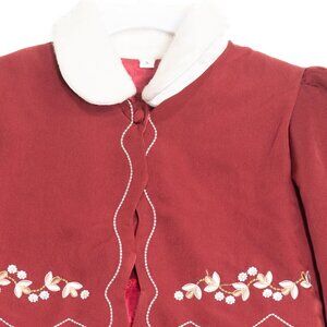 This charming burgundy dress is ideal for those who appreciate a touch of elegance in children's fashion. The embroidered bolero shrug adds sophistication, while the pleated skirt offers a timeless look. Perfect for special gatherings, the soft faux fur collar ensures comfort and warmth during cooler months.