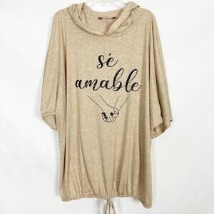 AMANA women's 'Se Amable' pullover in beige/tan. Hooded. V-neck. Short dolman sleeves. Drawstring hem. Relaxed fit. In great used condition. No stains, tears or holes.