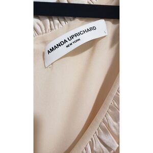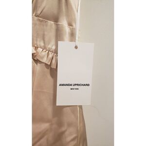 Make a stunning statement at your next wedding or party with this Amanda Uprichard champagne dress. This sleeveless, tiered, fit and flare mini dress is made of 100% matte silk with a round neckline and racerback strap type. The ivory color adds a touch of elegance, while the layered accents give it a unique touch. The dress has a zip closure and is perfect for summer or spring events. It comes in size L and is ideal for women who want a classic, designer piece in their collection.