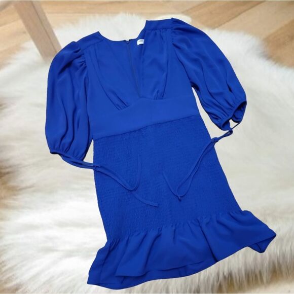 AMANDA UPRICHARD BLUE "GALA" MINI DRESS BALLON TIE STRING SLEEVES SMOCKED RUFFLE