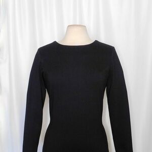 Curved neckline ~ Scoop V back with a bow across the middle of the back … open cutout underneath the bow ~ Long sleeves ~ Straight hemline ~ Semi-fitted sheath silhouette ~ Pullover styling … no closures ~ Soft ponte knit fabric with great stretch ~ Solid black … classic!