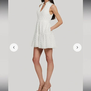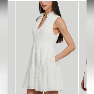 The Connolly dress is a tiered babydoll shape with ruffle neckline and pockets