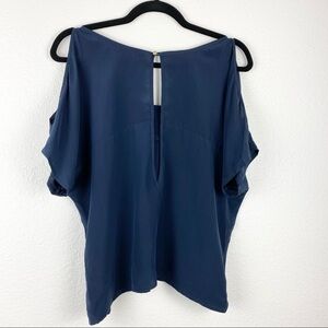 AMANDA UPRICHARD Navy Silk Cold Shoulder Blouse with large keyhole detail on the back, size medium.