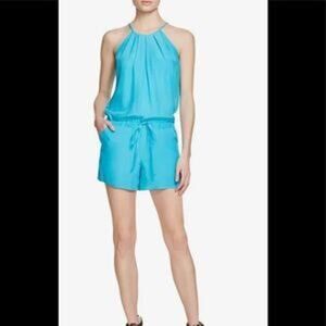 tags: revolve, teal, sky, shorts, mini, dress, spaghetti strap, tank top, halter, tie waist, blouson, sleeveless, keyhole, pockets, spring, summer, beach, vacation, coastal, travel, cruise, resort, minimalist, casual, 100% silk, p xs, 2 6 4 1112675