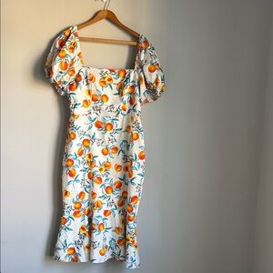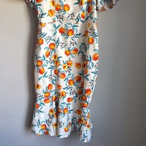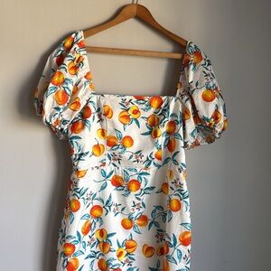 Make way for your new summer dress covered in a fun peach print and completed with a chic flounce hem. Square neck. Short puffed sleeves. Back concealed zip closure. Flounce hem. Allover peach print. Imported