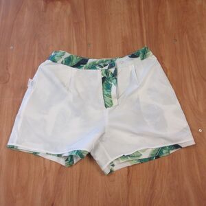 High-waisted shorts with green leaf pattern throughout, belt loops, and a front button closure. Features a classic style and true to size fit.