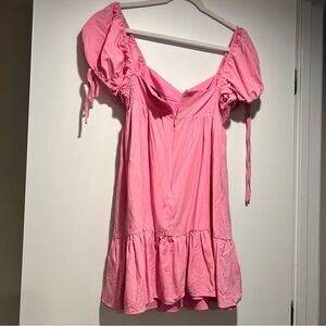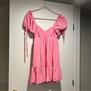 Stylish pink mini dress with short sleeves and ruffle hem. Perfect for a casual outing or a summer party.