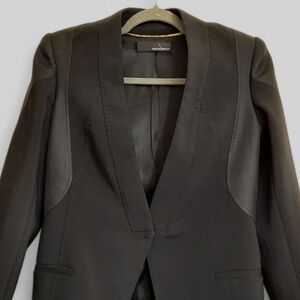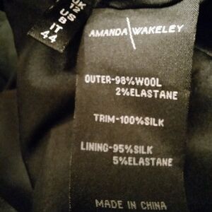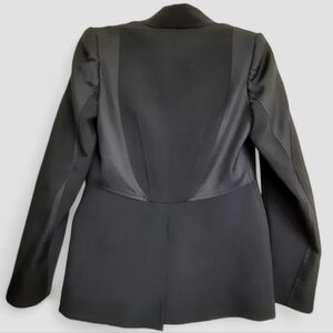 Amanda Wakeley monochrome blazer in size 8. Inspired by an equestrian riding jacket. Made with fine materials and tailoring. Wool outer with silk trim. Gives a nice black on black monochromatic effect. Tonal stitching. Sleek jetted pockets. Fitted/darting. Narrow internal shoulder pads to give the perfect amount of structure. Concealed snap closure. Vented back. Silk lining. A timeless investment piece.