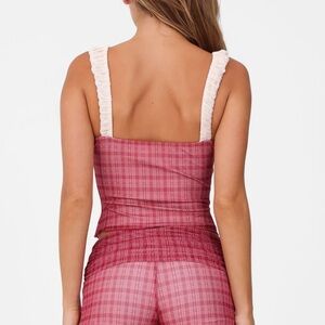 This stylish plaid camisole top features a charming ruffle trim. Perfect for a chic and comfortable look.
