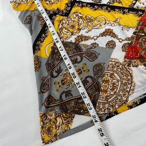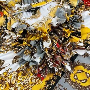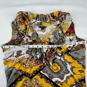 A yellow, red, and white Venetian chain pattern tank top with bold ruffles lining the neckline, size medium. Slightly stretchy material.