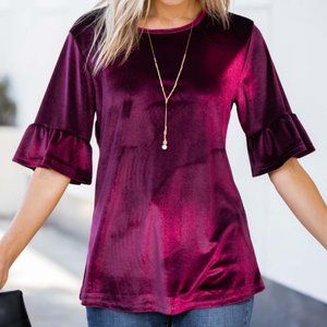 AMARYLLIS | Wine Velvet Ruffle-Accent Short-Sleeve Top (Size: Medium)