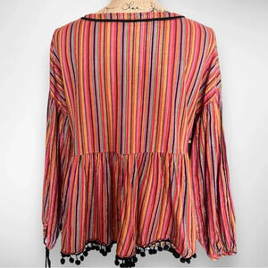 AMARYLLIS Women's Colorful Striped Long Sleeve Top With Pom Pom Trim Small | EUC