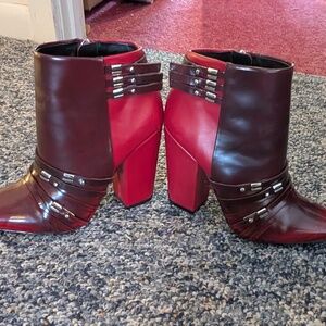 L.A.M.B Gwen Stefani dark red and pinkish red-hued high-heeled boots in a women's size 6. There is writing in marker on the bottom of the shoes. Worn a couple of times and in very good condition.