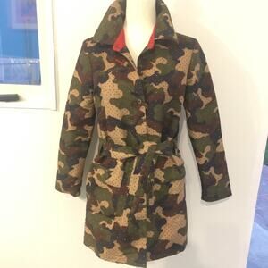 EXCELLENT CONDITION PUMA CAMO COAT WITH RED LINING. TIE BELT. TRENCH COAT OR UTILITY STYLE BELTED COAT.