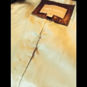 This is THE softest leather you'll ever feel. It's cozy and warm. Button front, two pockets, mid-thigh. Sorry dogs not included. They wouldn't get out of the pic. There is a slight pull on the inside seam where it's starting to come apart. Easy fix. Otherwise mint condition.