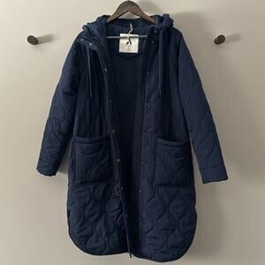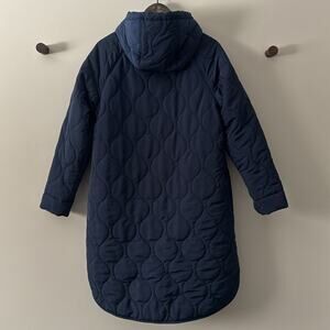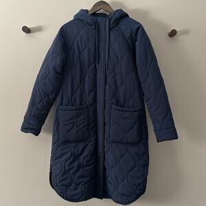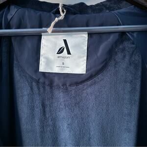 NWOT AMAZON ESSENTIALS WOMEN’S WATER-REPELLENT MID-LENGTH QUILTED HOODED COAT NAVY BLUE SIZE SMALL VELOUR LINED BODY & POCKETS (ARMS HAVE STANDARD LINING AS SHOWN IN PICS) THIS JACKET HAS HIDDEN ZIP UP POCKETS WHICH ARE ALSO SHOWN ABOVE