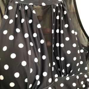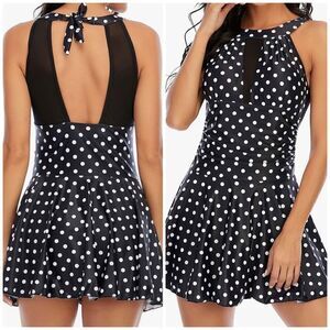 I’m crazy about this Amazon One-Piece, Tummy Control Halter Swim Dress in ladies size medium. It has removable padded cups and an A-line design with built-in bottoms. High neckline with see-through mesh and a deep, plunging back, also framed in mesh. Side ruching helps to make the waist look smaller, and a flared skirt make this extremely figure flattering. It’s flirty but provides full coverage. Attached bottoms with sanitary shield intact. It’s 82% polyester and 18% spandex. Hand washing is recommended and hang to dry. The pit-to-pit measurement is 17” (without stretching), the waist is 28” in circumference and it’s 30” long. MSRP $31. So cute with the black and white polkadot and NWOT! ♥️