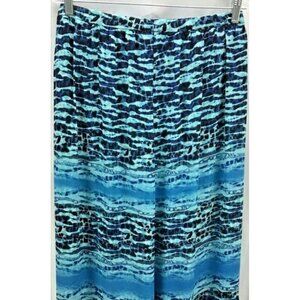 A women's size medium skirt from AMBAR. The skirt is in shades of blue, black and white with an abstract pattern. The skirt is lined, shift style, back zipper, split hem and long. THe skirt is new with tags.